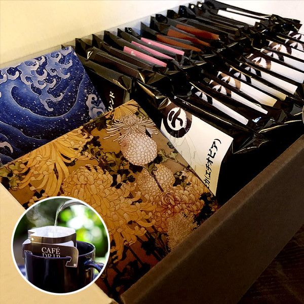 大人数への贈り物に最適なドリップバッグの詰め合わせです。ブレンド北斎の菊と男浪、9種のコーヒーがお楽しみいただけます。ドリップバッグは器具がなくても気軽にコーヒーをお召し上がりいただけます。【手提げ袋(無地)付き】